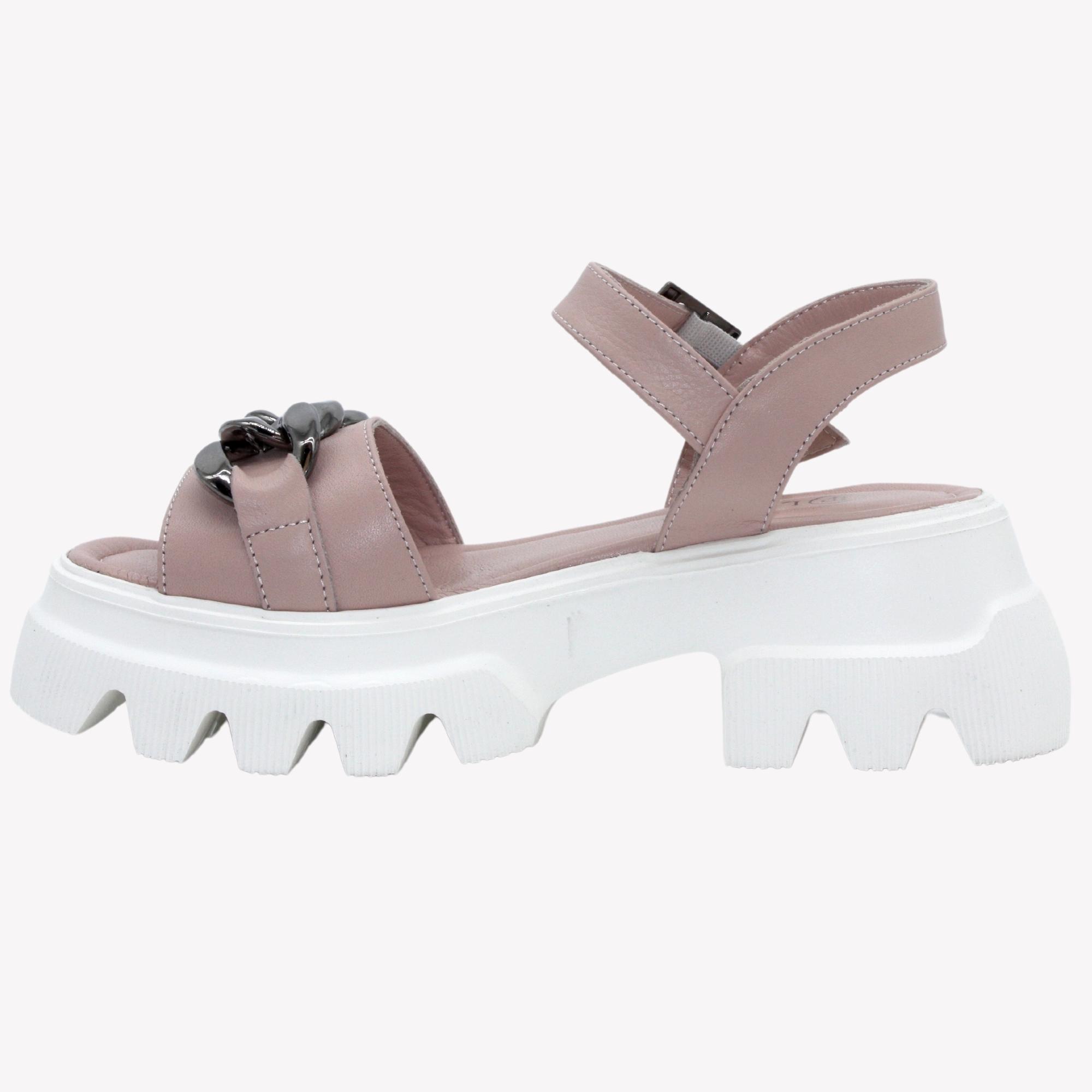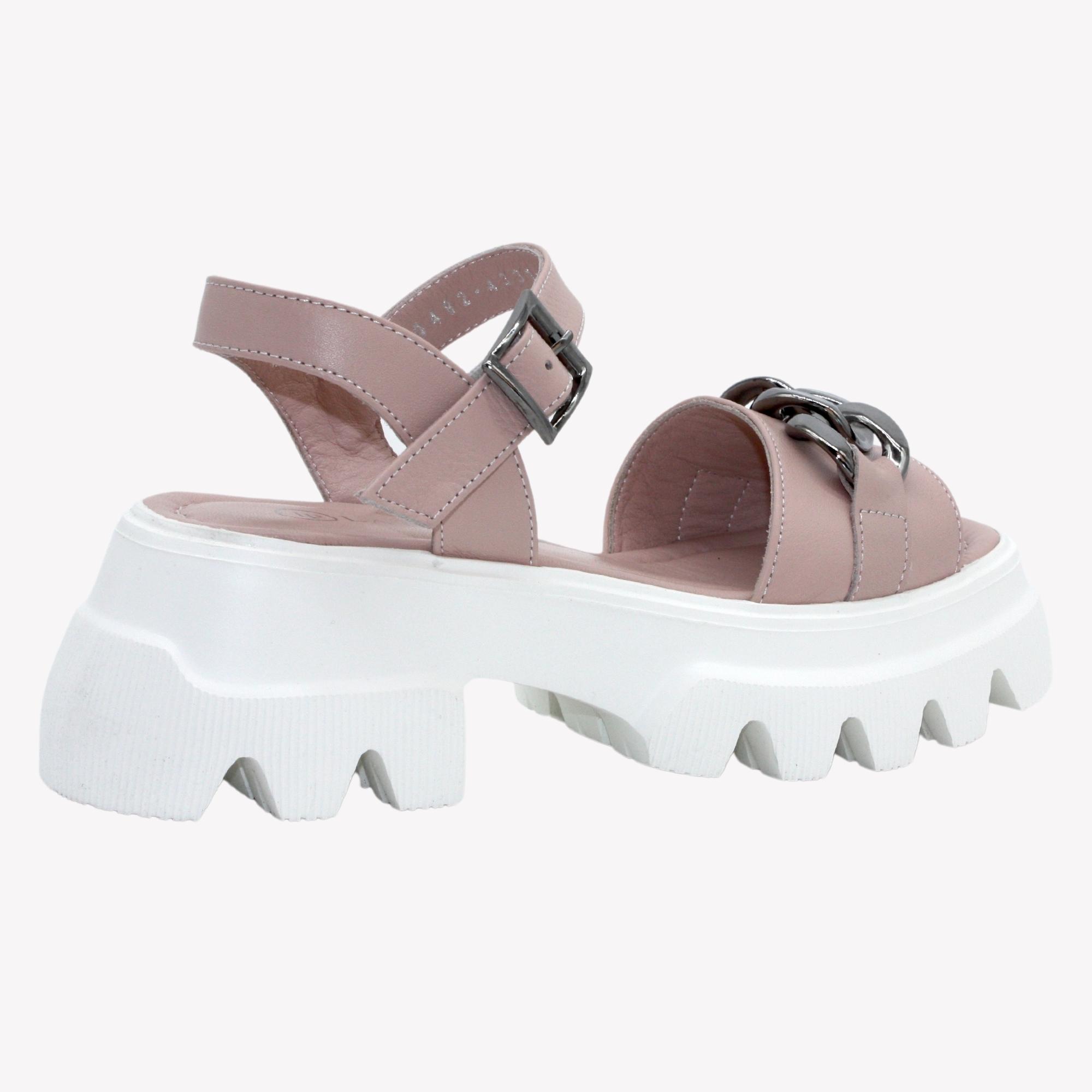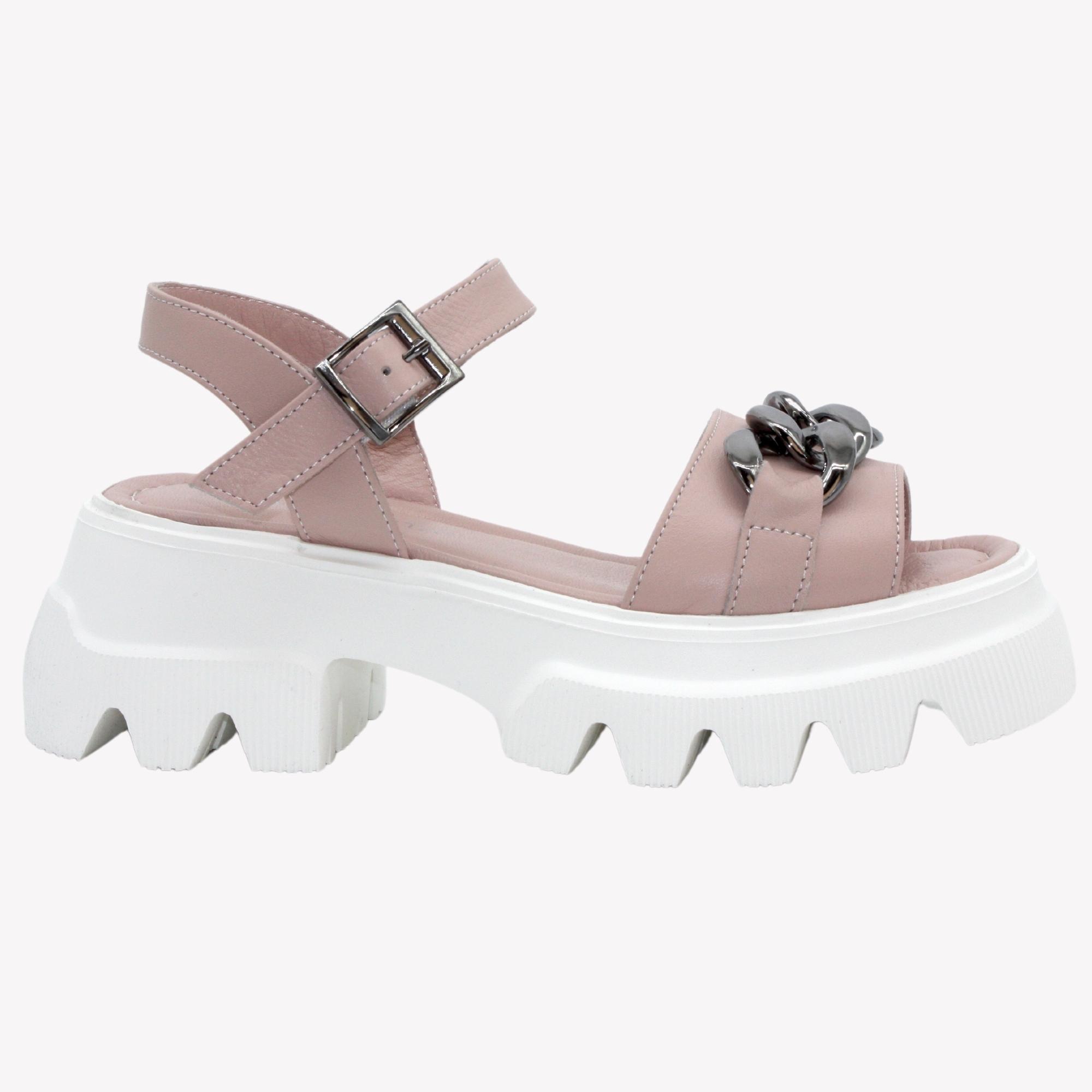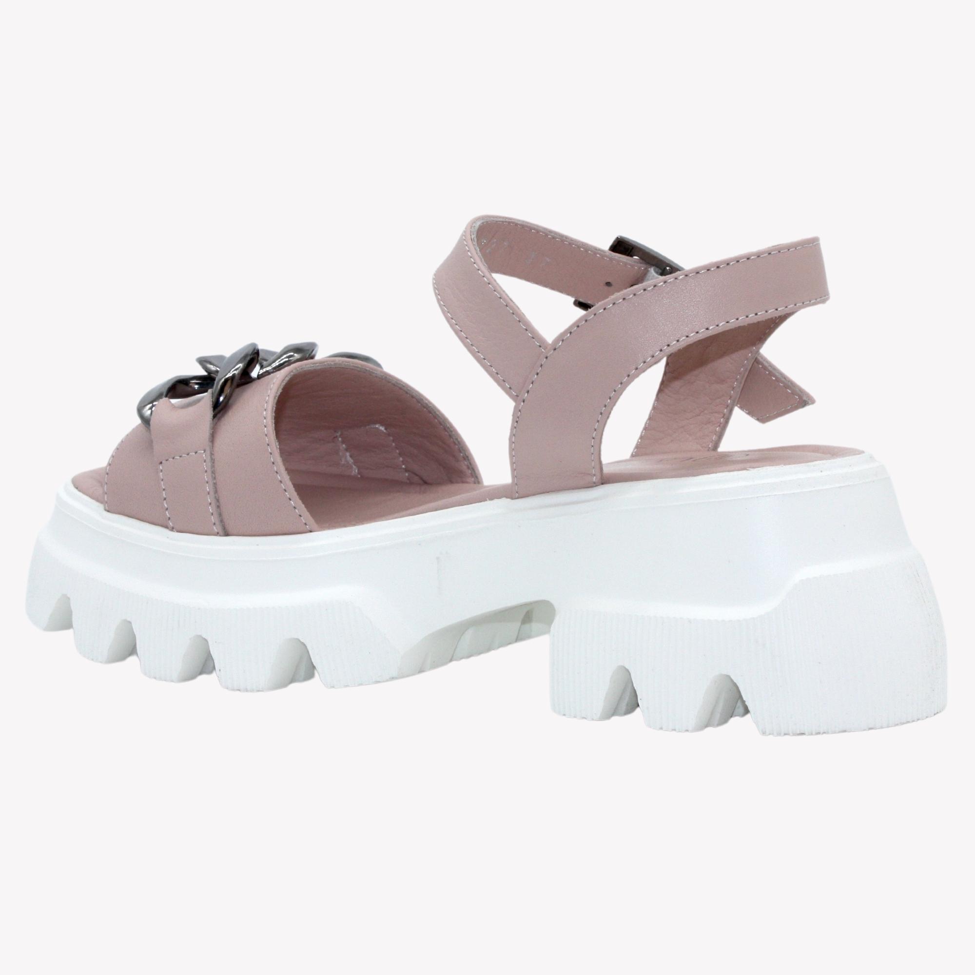Sandále s kovovým řetízkem na nártu, které dokážete sladit s celým šatníkem díky neutrální barvě.