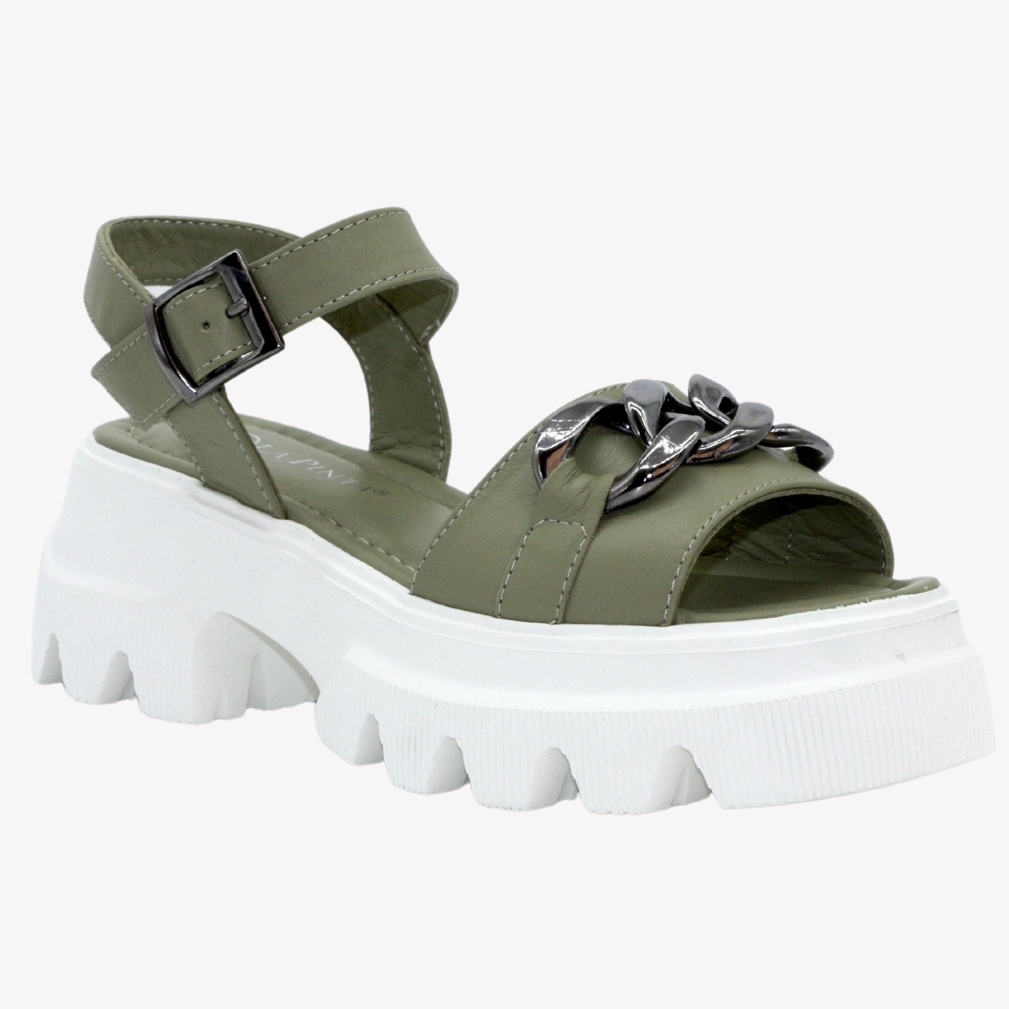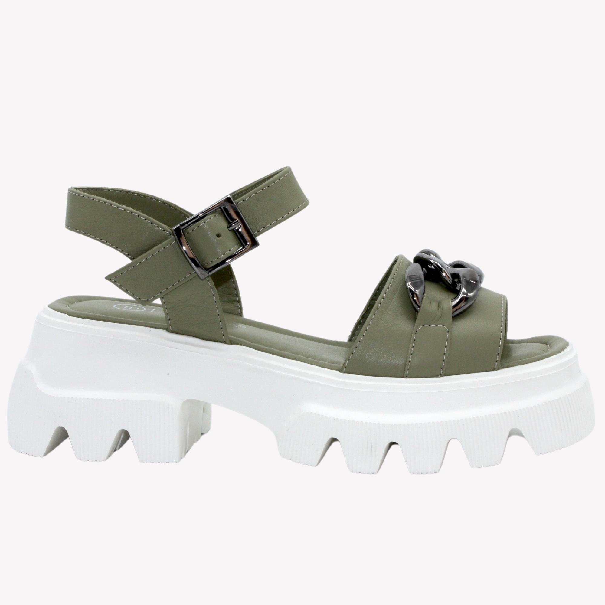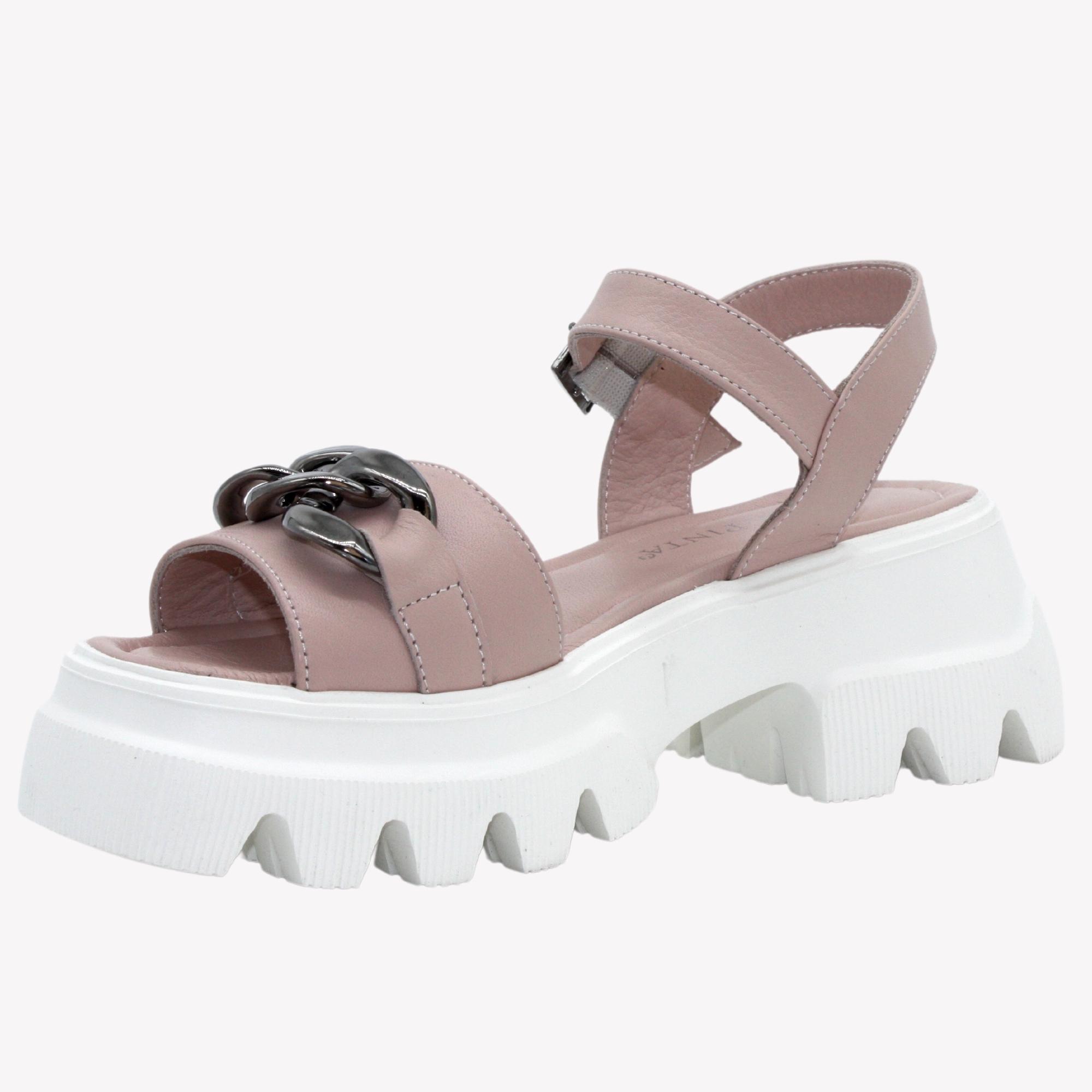 Sandále s kovovým řetízkem na nártu, které dokážete sladit s celým šatníkem díky neutrální barvě.