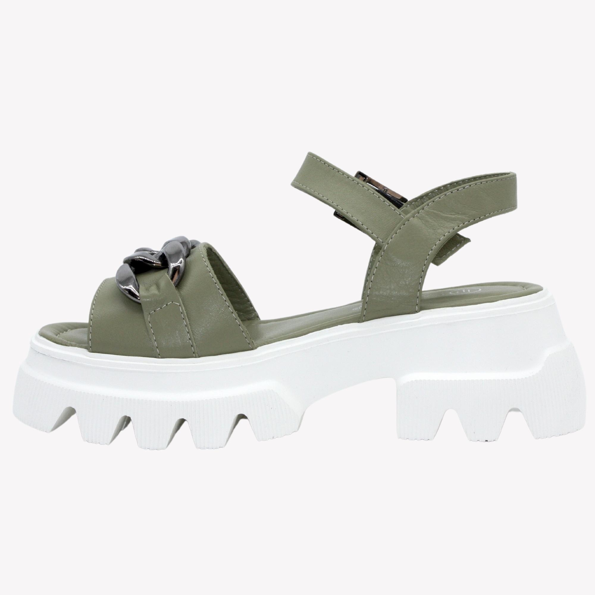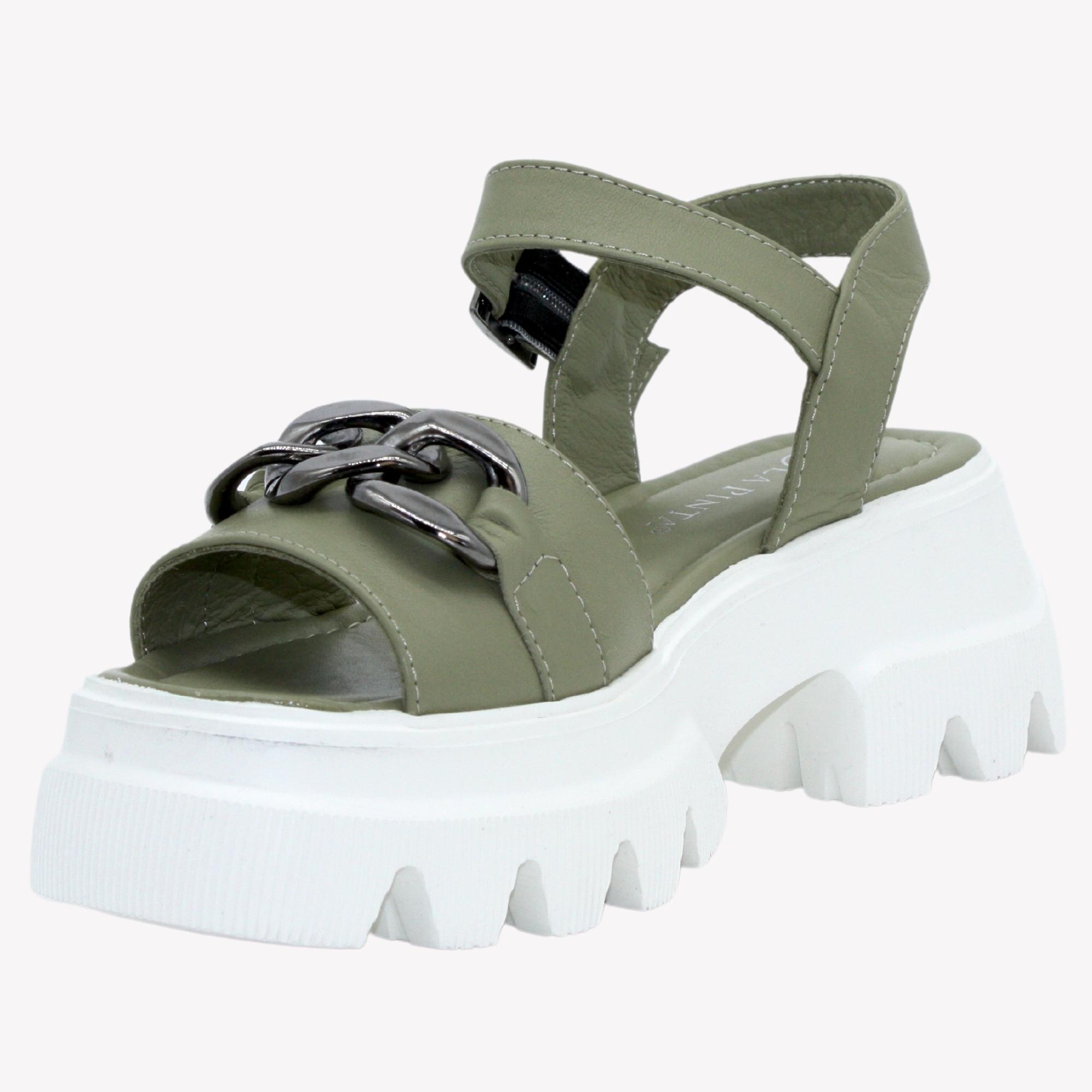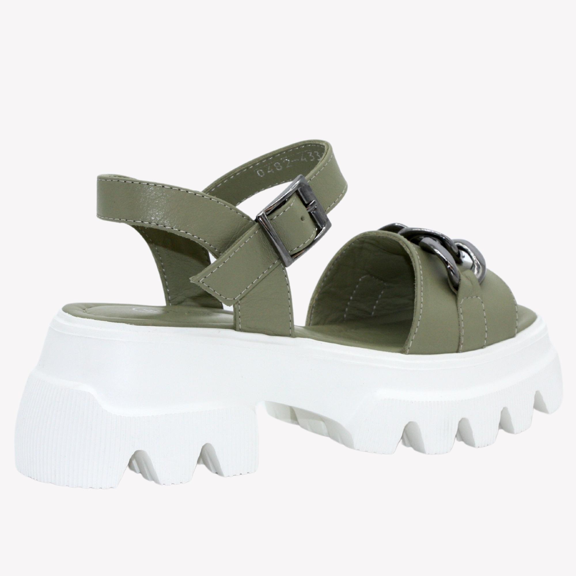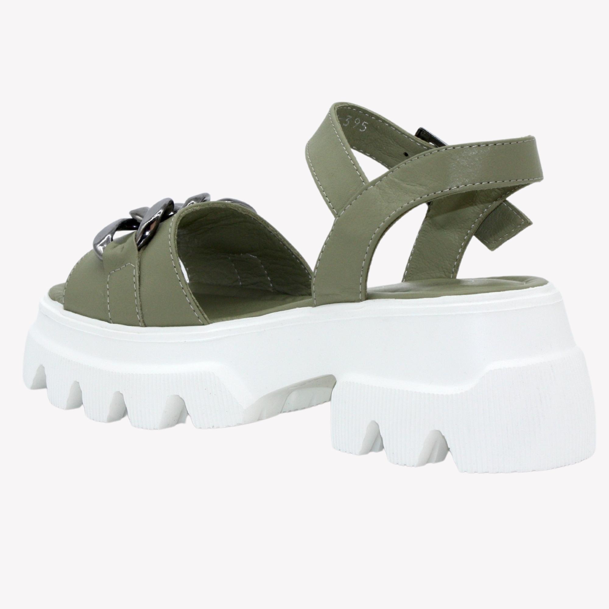 Sandále s kovovým řetízkem na nártu, které dokážete sladit s celým šatníkem díky neutrální barvě.