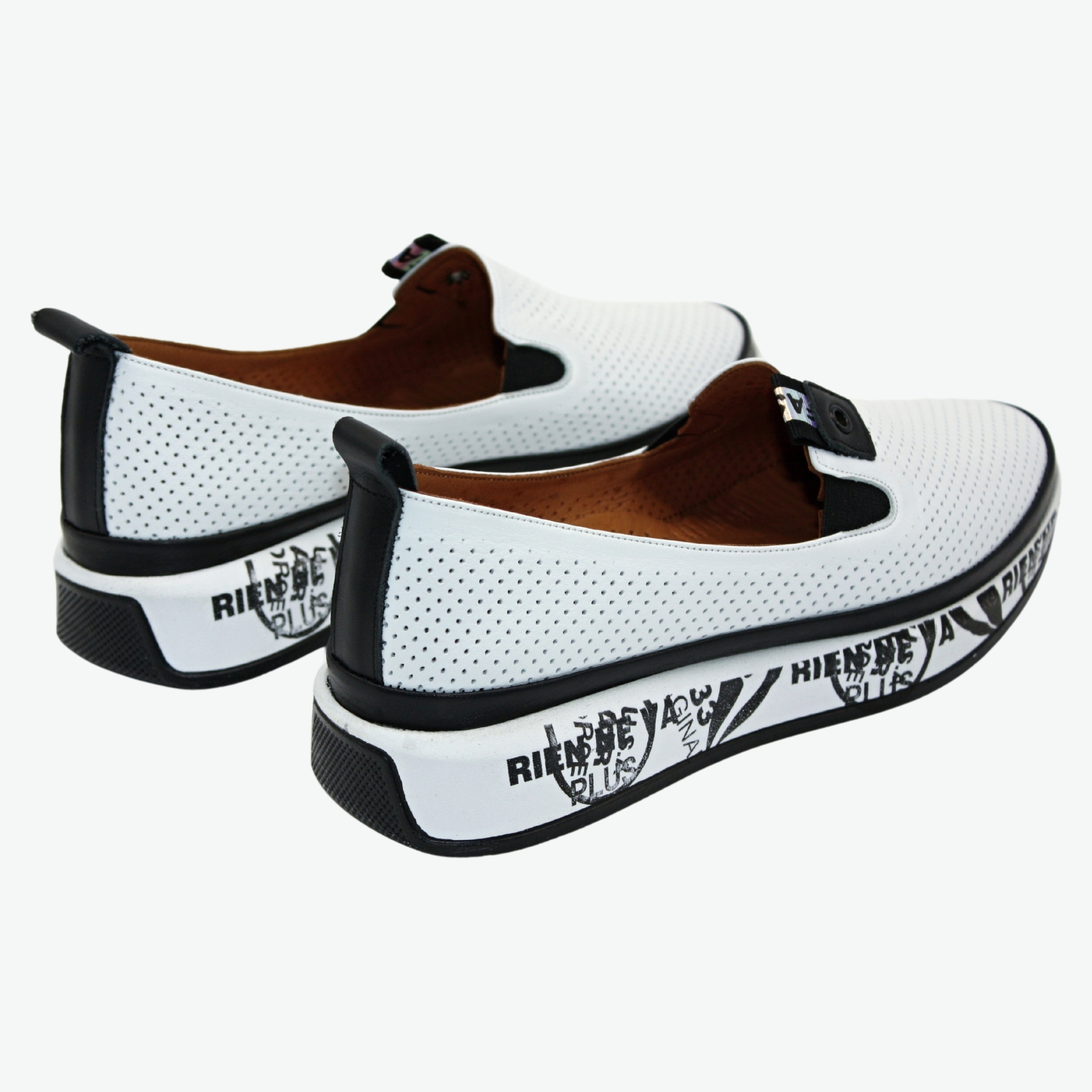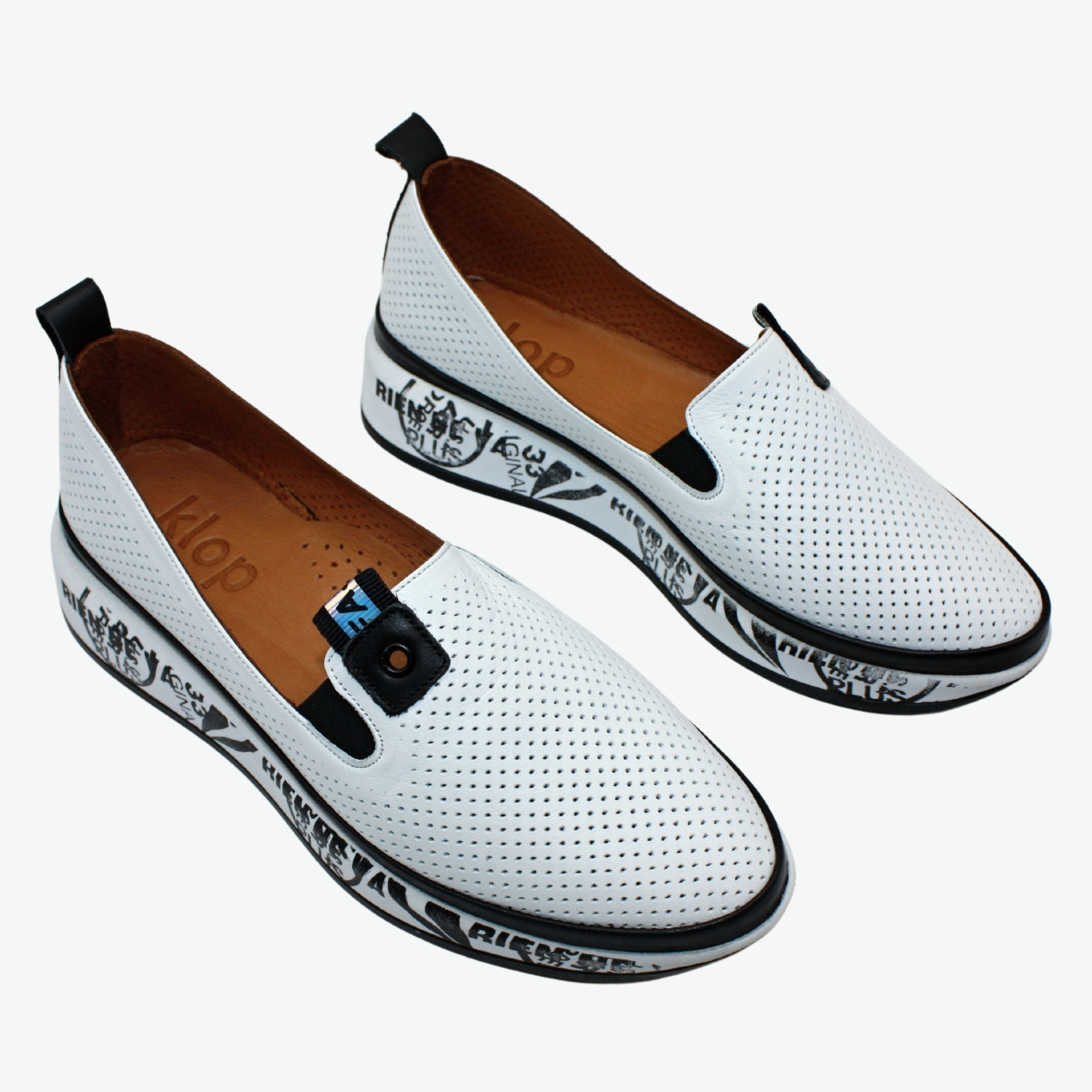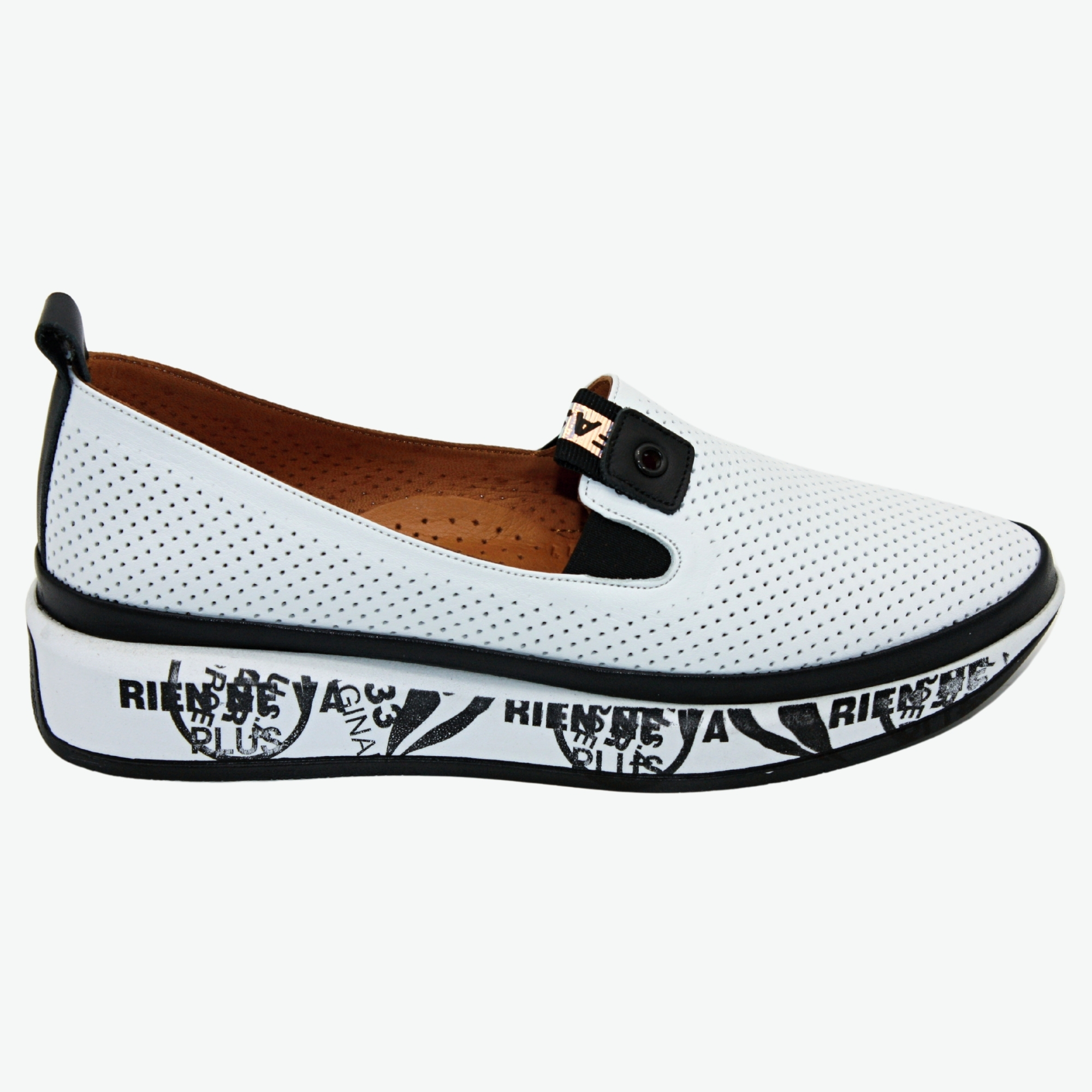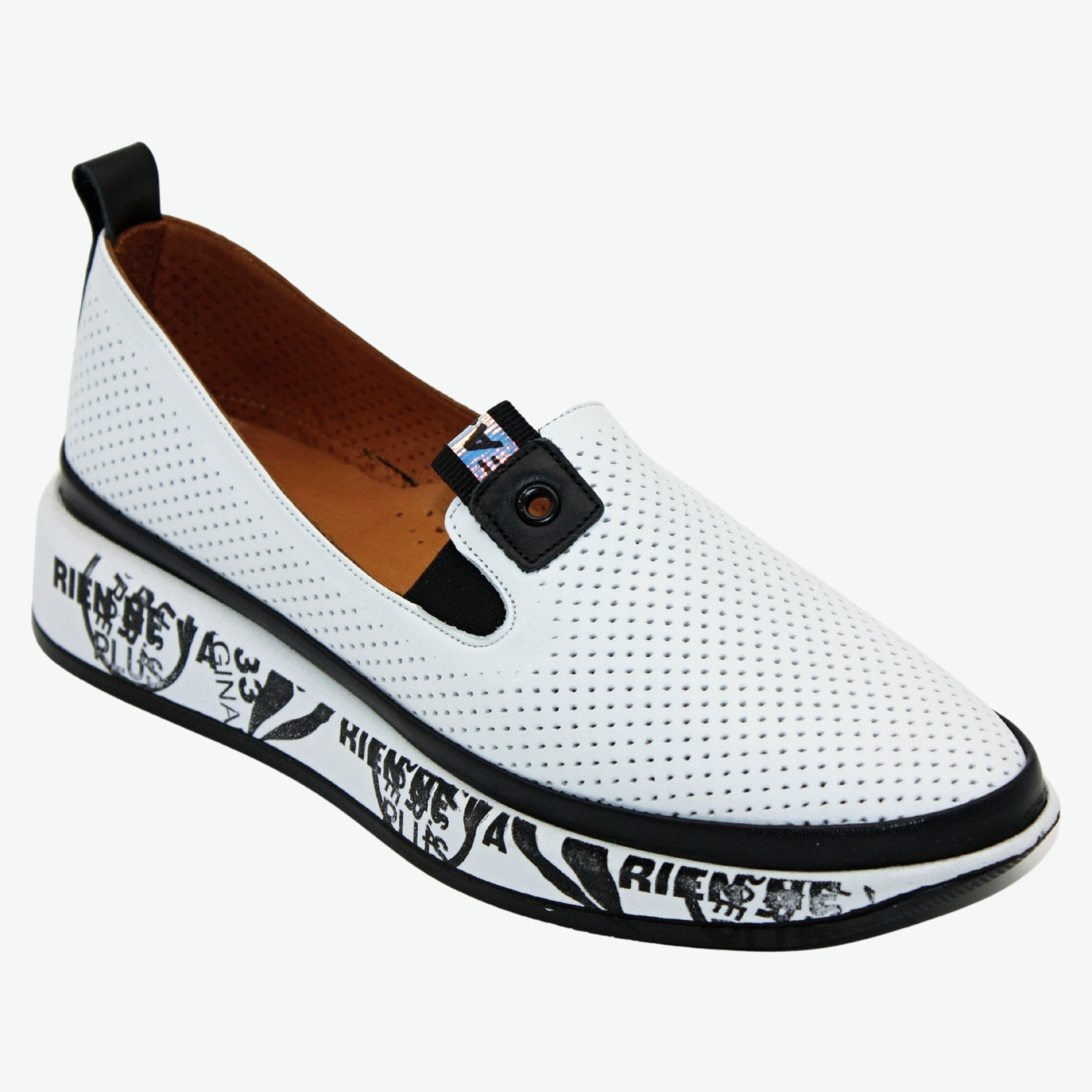 Elegantní černobílé kožené nazouvací mokasíny s děrováním a netradiční podrážkou. Příjemně se nosí a jsou prodyšné. Podešev na mírném klínu dodává stabilitu a opticky prodlužuje nohy. Stélka je tvarovaná a vyměkčená, díky čemuž jsou boty velmi pohodlné. Styl: casual.