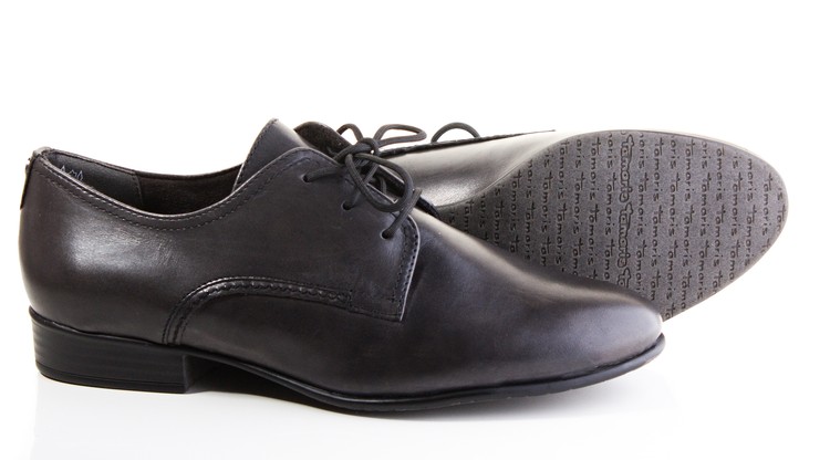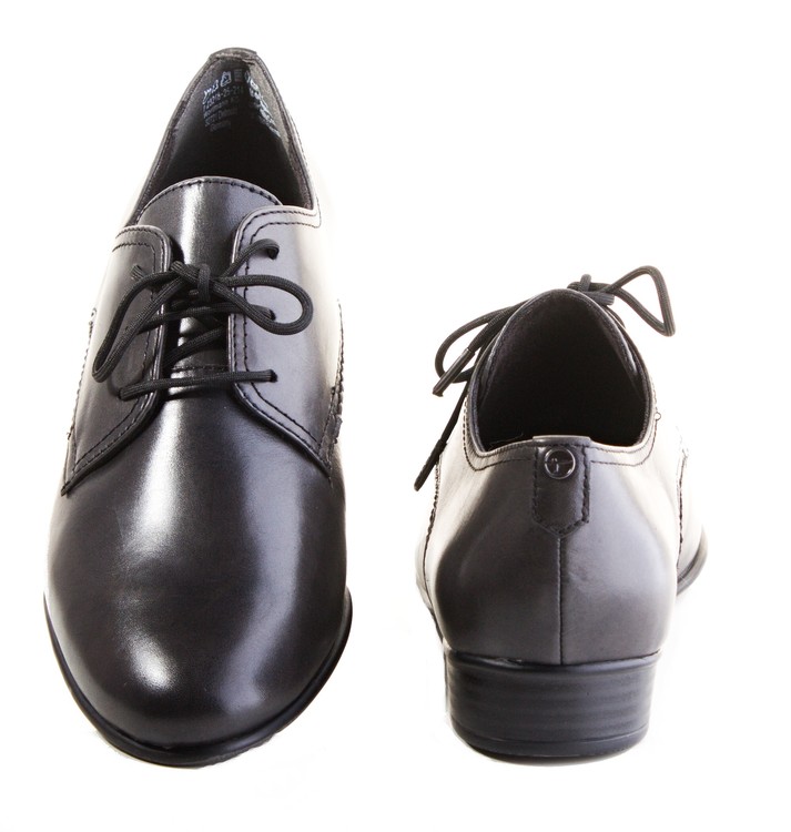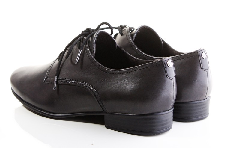 Elegantní, stylové polobotky na šněrování vhodné ke kalhotám i sukni na nízkém podpatku, v černé barvě. Výška podpatku je cca 2 cm. Povrchový materiál bot tvoří hladká kůže, podšívku kombinace textilu a syntetiky, stélka je syntetická a vyměkčená. Podešev je syntetiká. Tato obuv je kompromisem mezi elegantní a pohodlnou botou.