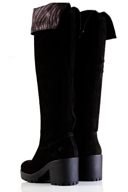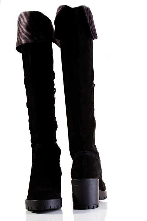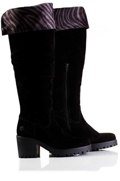 Atraktivní kozačky nad kolena se zapínáním na kratší zip, které lze nosit naprosto univerzálně na vysokém podpatku. Výška podpatku je cca 7 cm. Povrchový materiál bot tvoří broušená kůže, podšívku a stélku textil. Podešev je syntetická a v přední části měří cca 2 cm. V těchto botách budete vypadat luxusně.