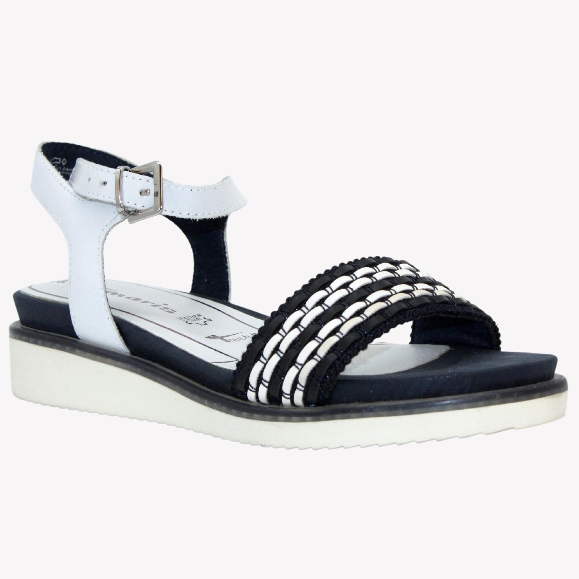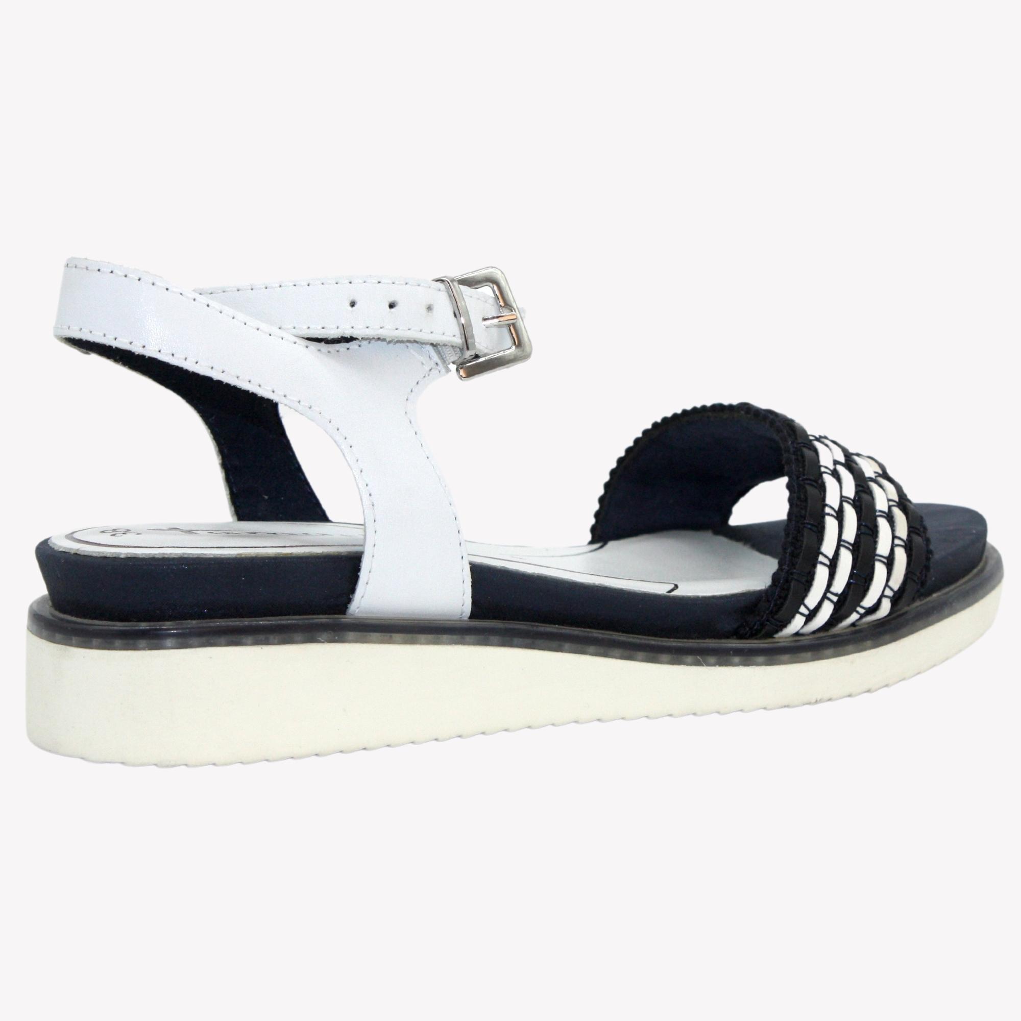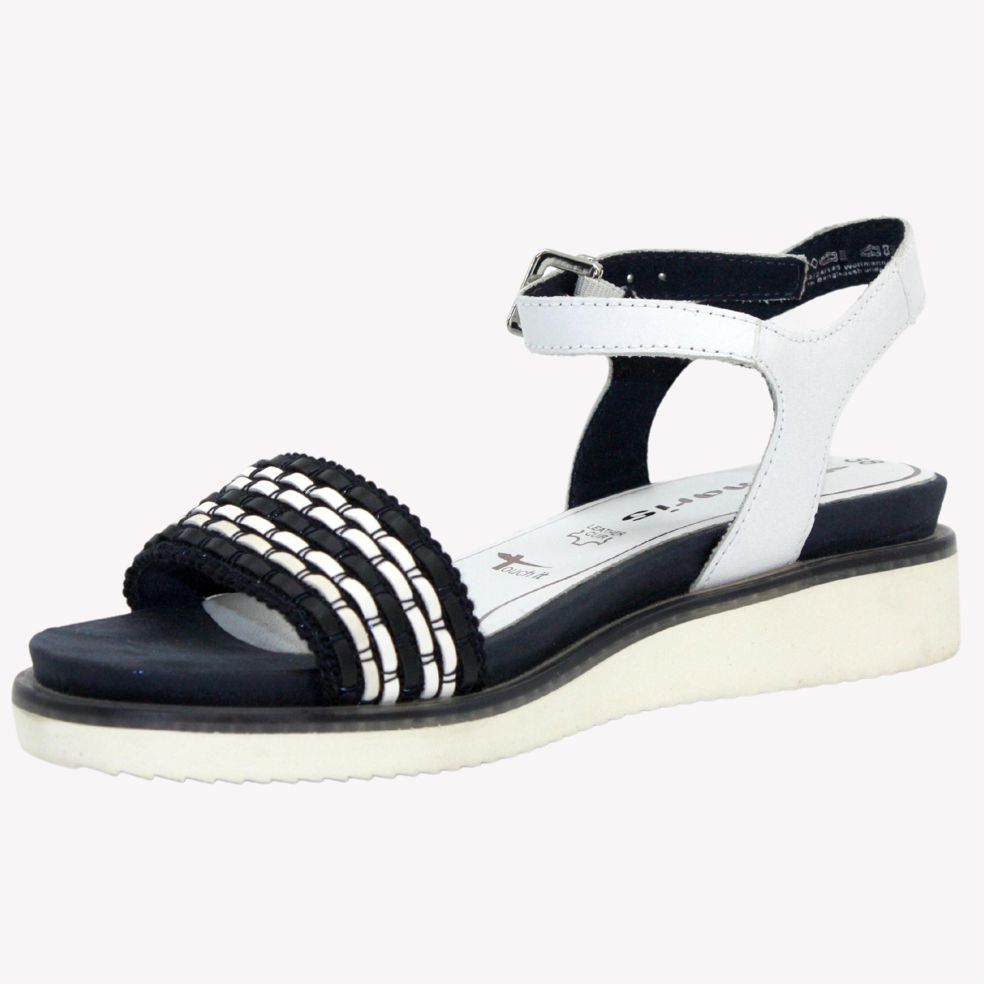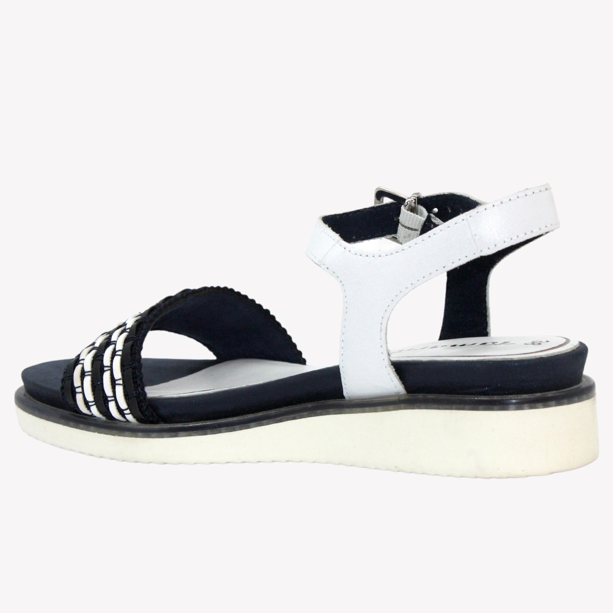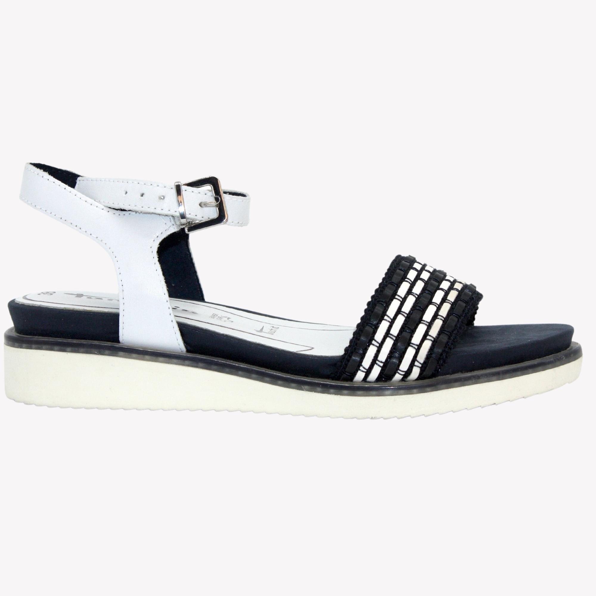 Ležérní sandále, vhodné k velkému spektru barevného oblečení na mírném klínku, v krásné bílo - modré kombinaci. Výška klínku je cca 3 cm. Povrchový materiál bot tvoří kombinace kůže a syntetiky, podšívku textil a stélka je kombinace kůže a textilu, vyměkčená a tvořena komfortním systémem ,,Touch it´´. Jeho výhodou je přizpůsobivost stélky po krátké době nošení individuálním požadavkům Vaší nohy. Podešev je syntetická, flexibilní a v přední části měří cca 1,5 cm. Ozdobte se těmito botami.