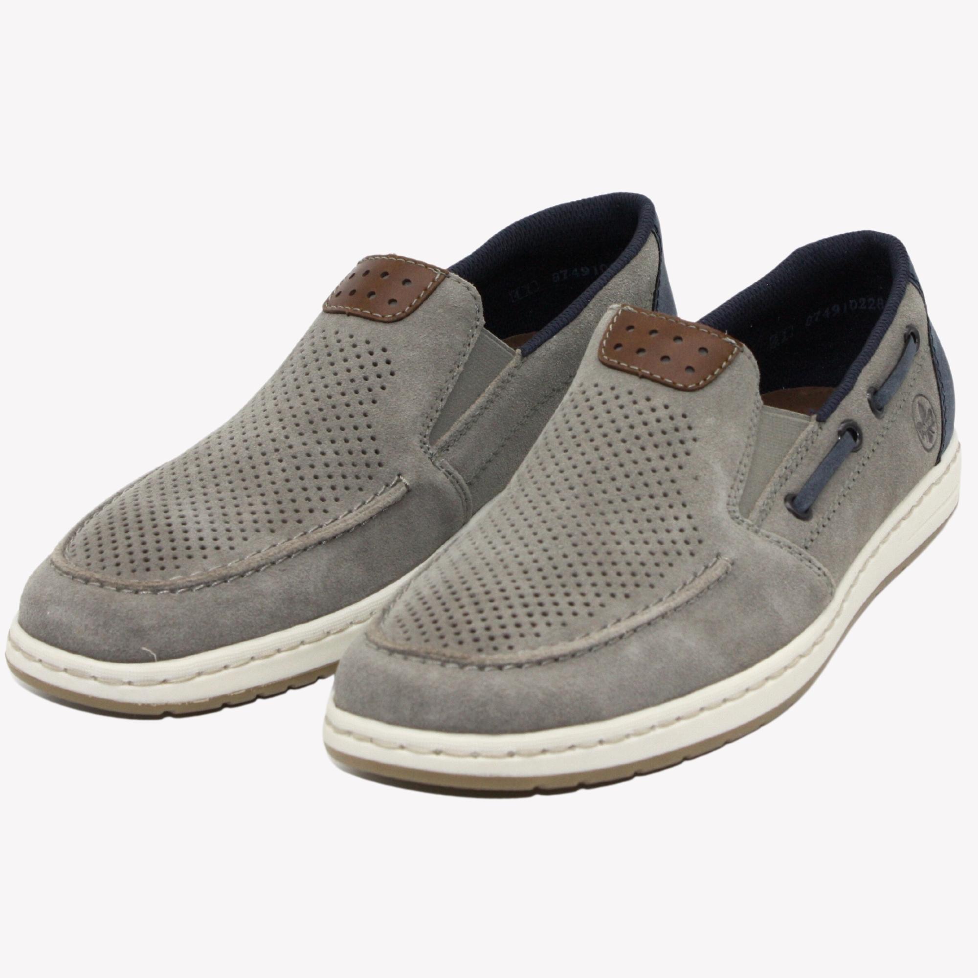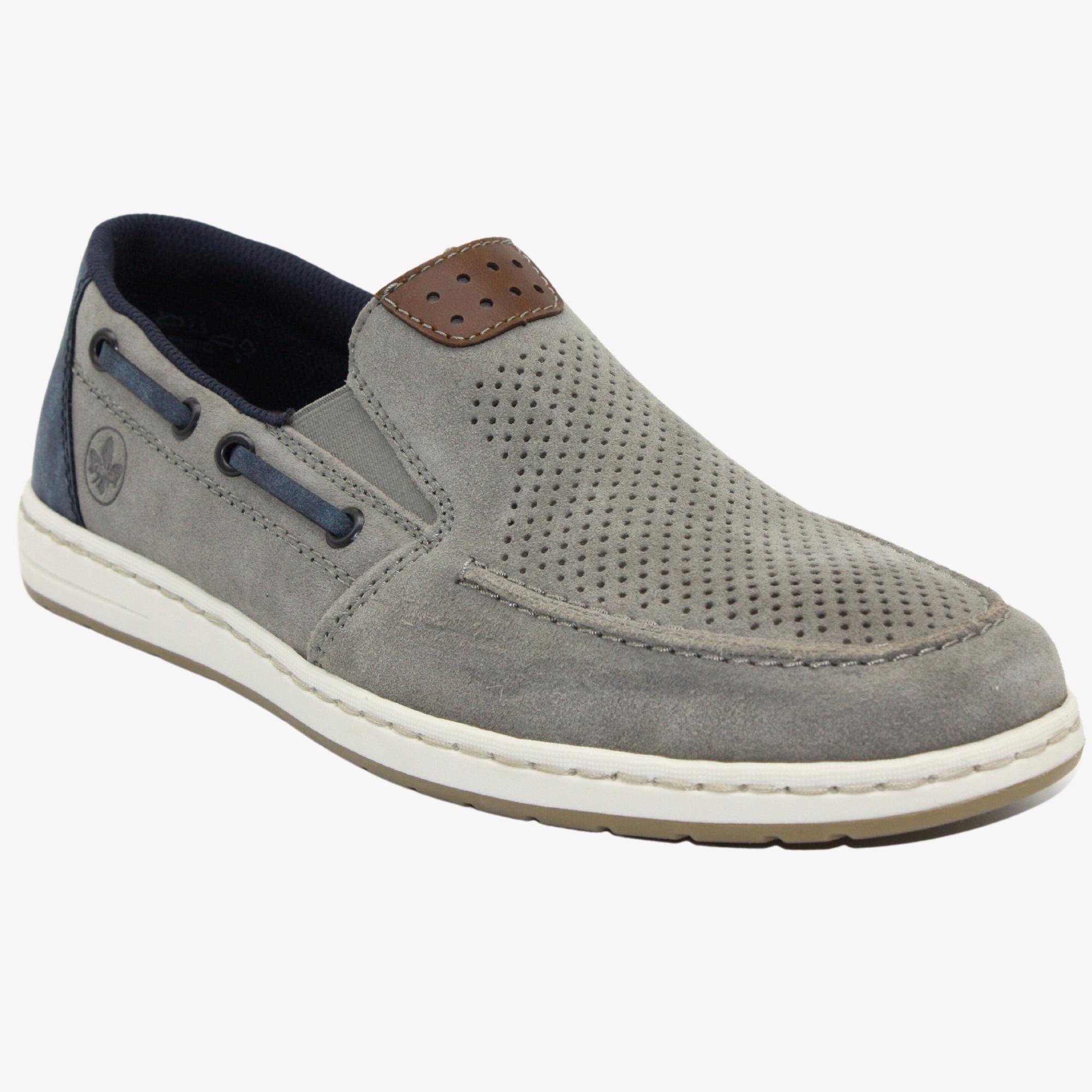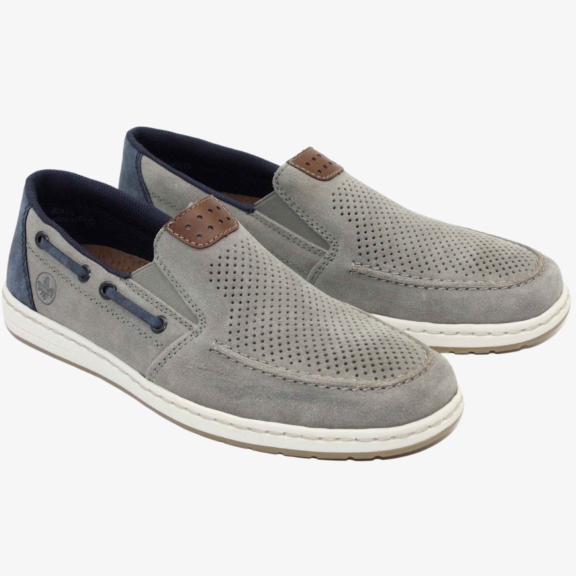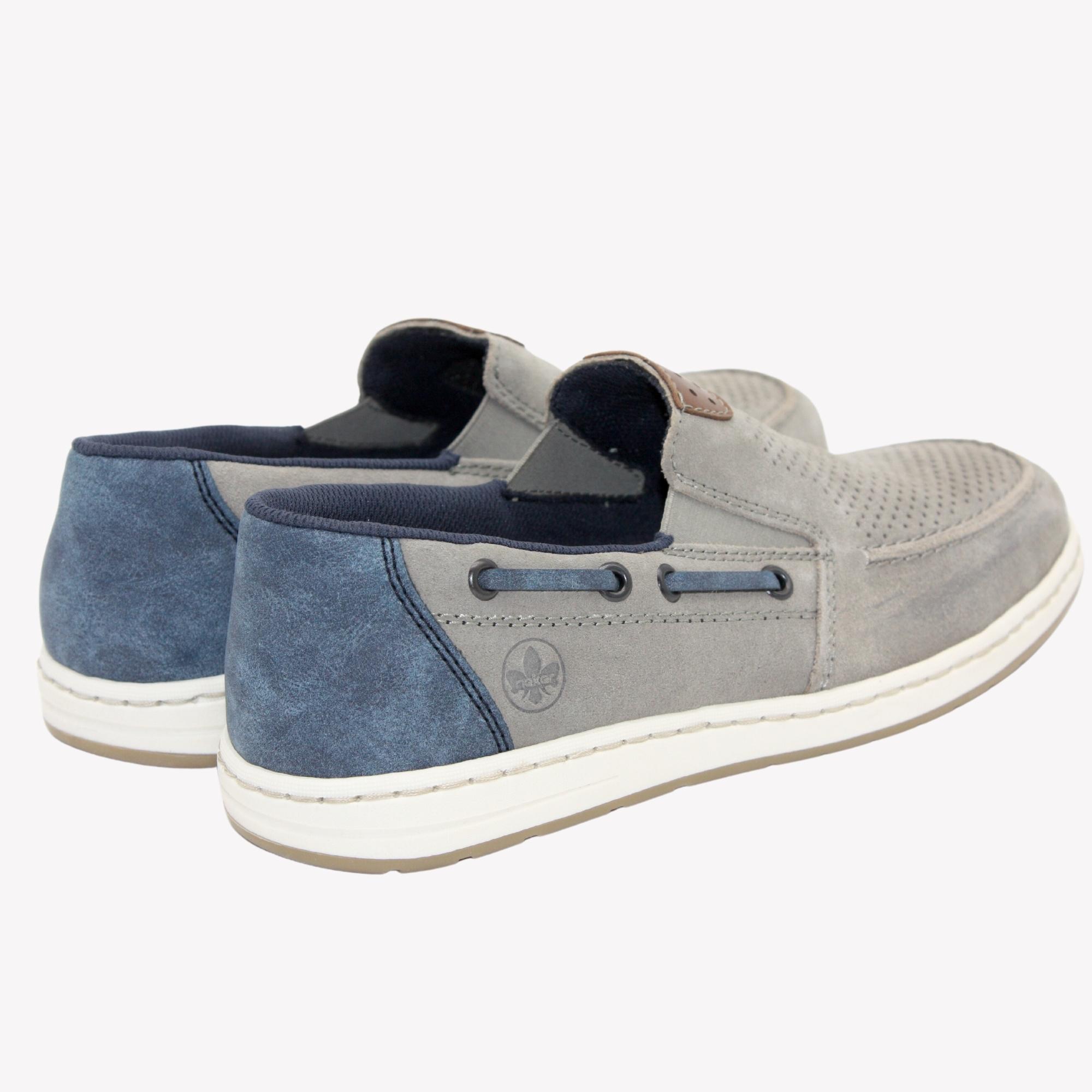 Pánské městské mokasíny s ozdobným tenkým páskem v oblasti kotníku a vyměkčenou stélkou. Díky gumovým vsadkám jsou lehce prozutelné a vhodné i pro vyšší nárt.Velice oblíbená, pohodlná obuv Rieker je na našem trhu již celé desetiletí zavedenou značkou.