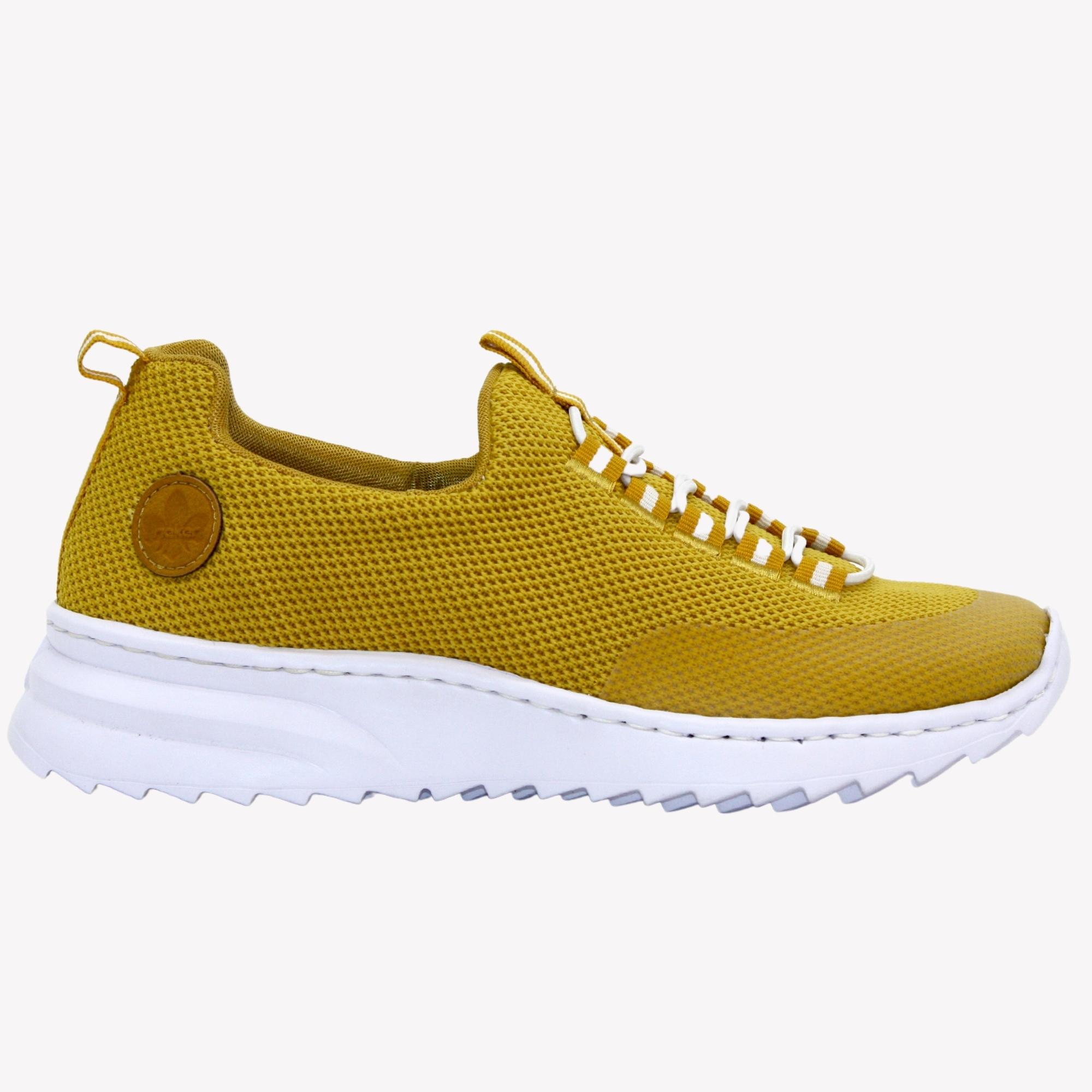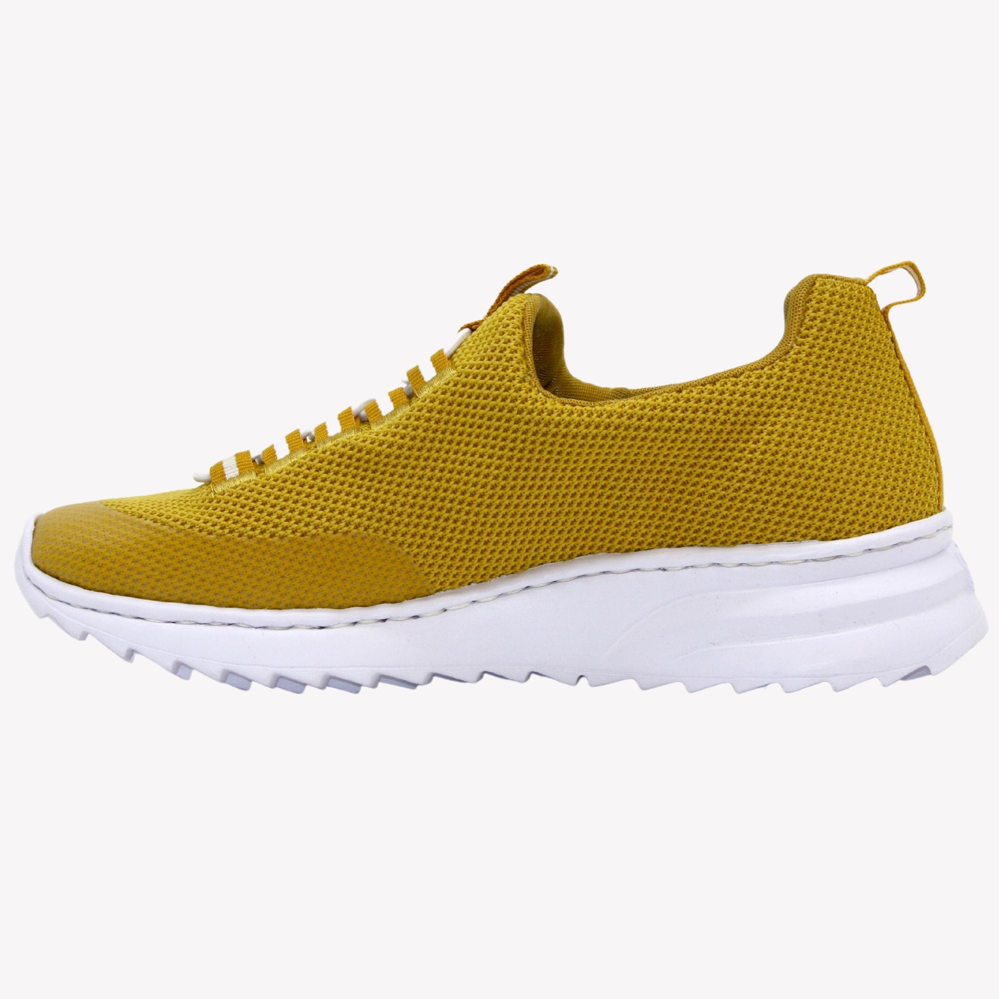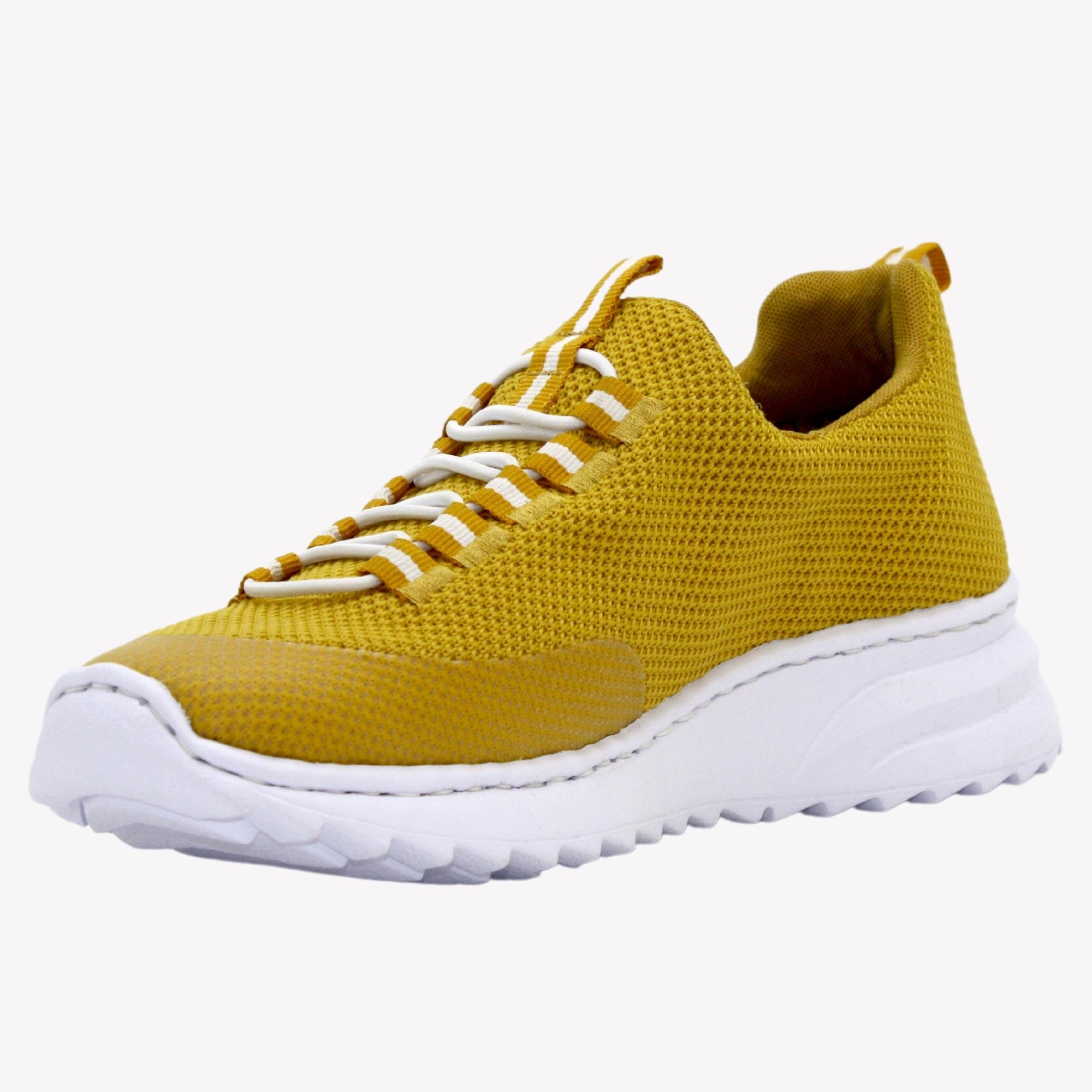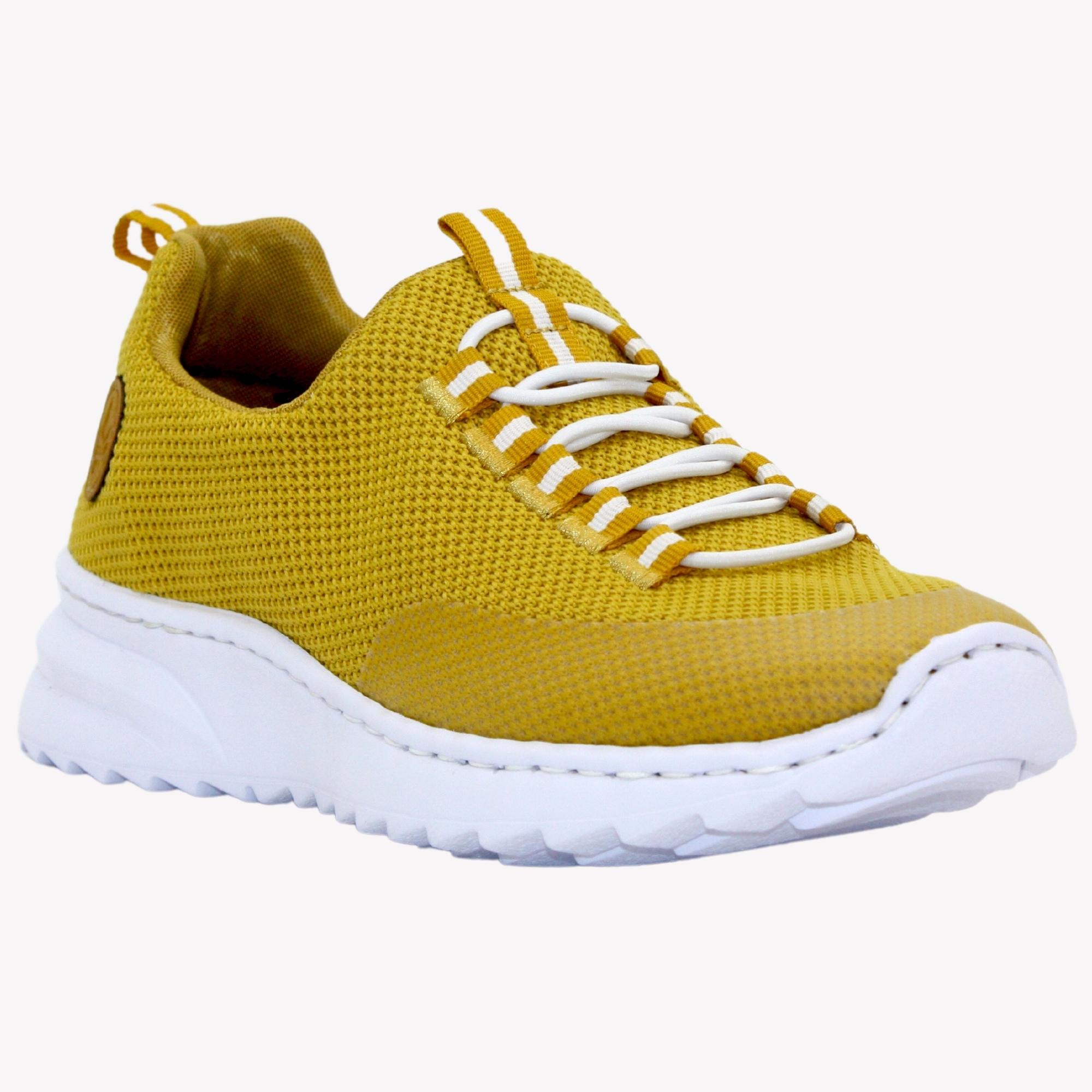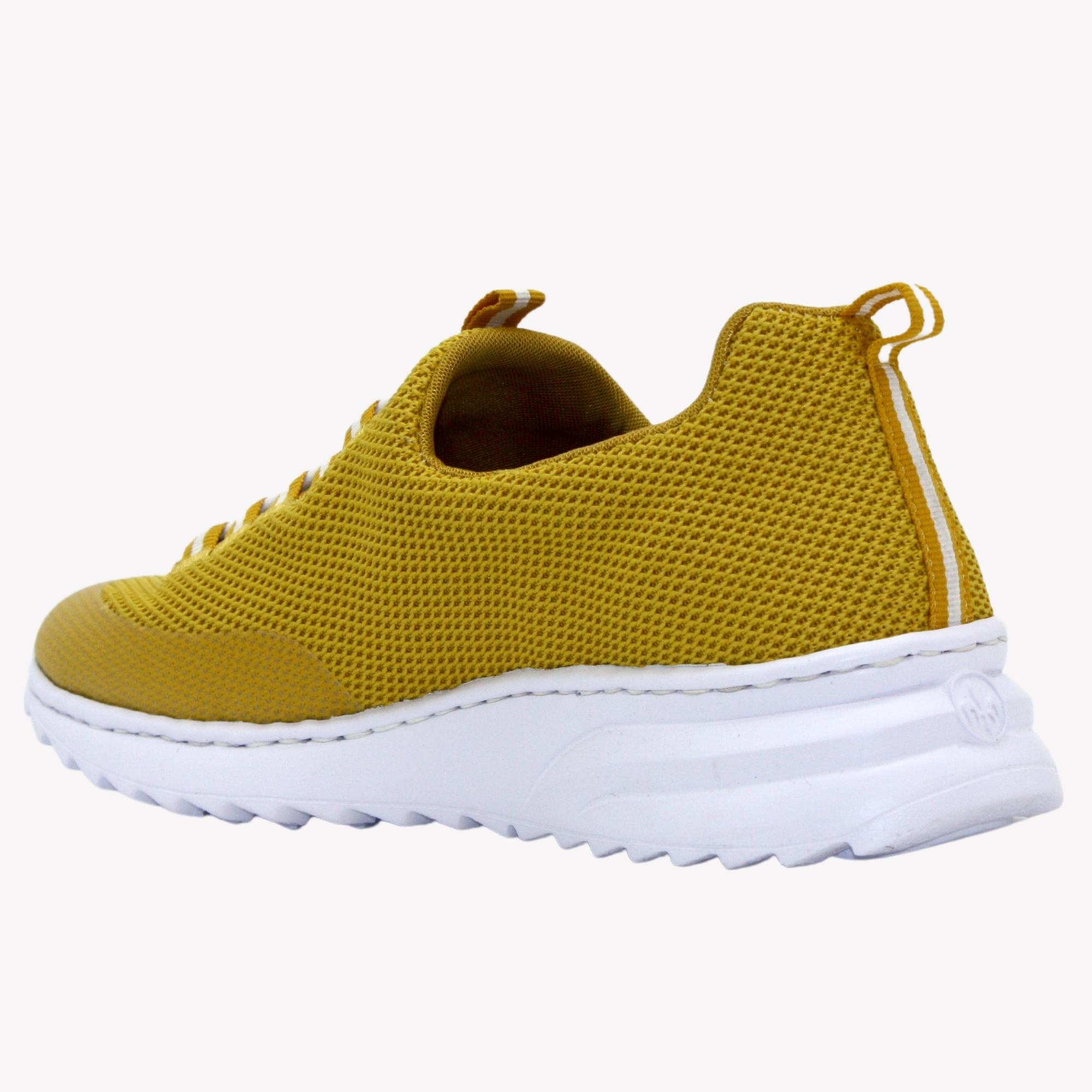 Dámské tenisky jsou v nádherné žluté barvě, svršku úpletového vzhledu na mírně zvýšené bílé podešvi. Obuv je opatřena komfortní, stahovací šňůrkou pro snažší nazouvání. Povrchový materiál bot tvoří syntetika, podšívka a stélka je také syntetická . Stélka memoSoft – unikátní stélka z paměťové pěny, která změkčuje došlap, ale také se maximálně přizpůsobí tvaru Vašeho chodidla .Podešev je syntetická. Tyto tenisky Vás překvapí svojí lehkostí.
